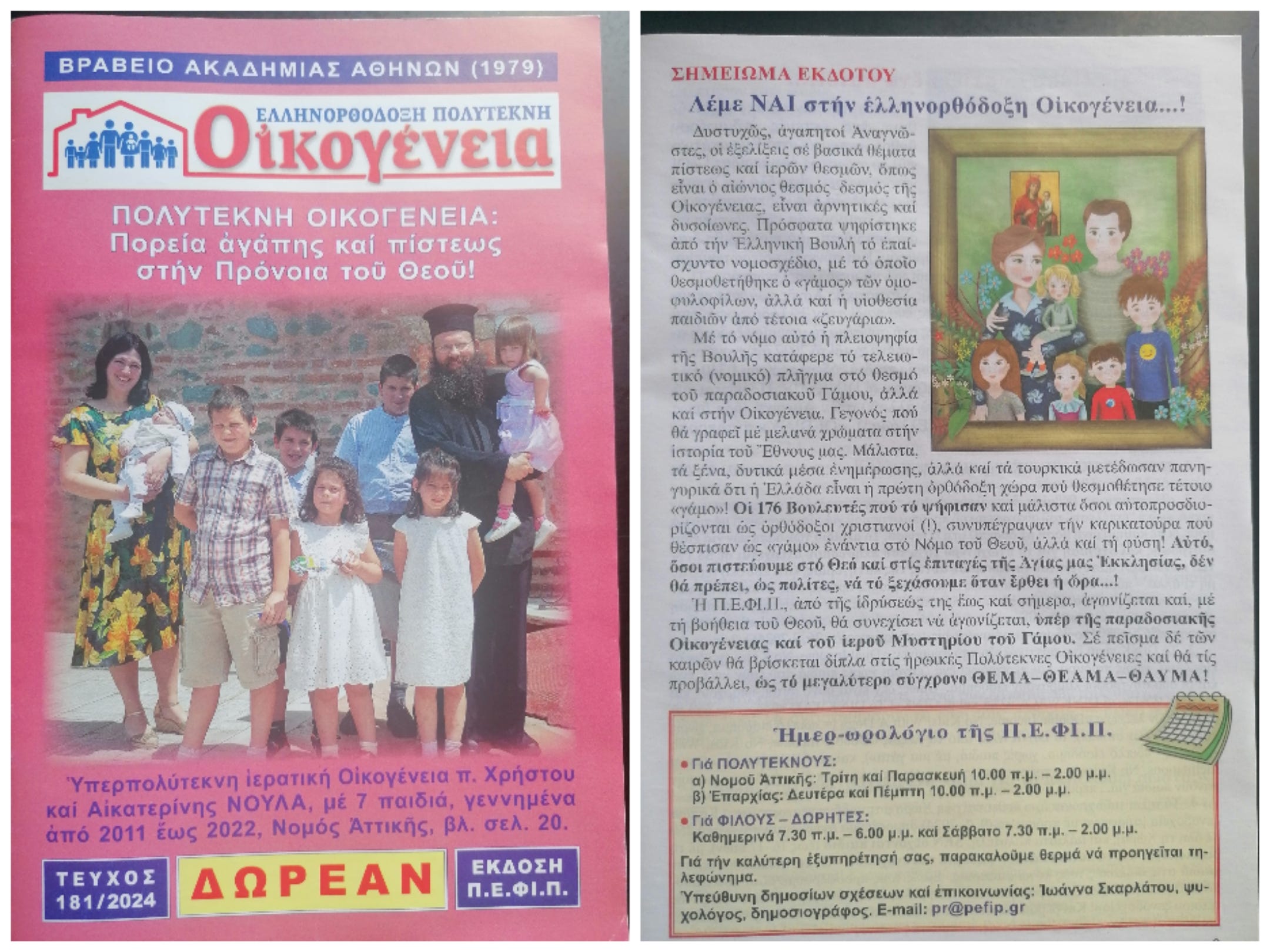 ‘Unfortunately dear readers, the developments on the holy matters of our faith, like the eternal union of the family are negative…Recently the Greek Government passed ‘marriage’ and even 'adoption of children for homosexual ‘couples’. This blew a deep wound into the eternal and traditional marriage as well as the family. This fact will be written with dark colors in the history of our nation…politicians who claim to be Christian voted for the caricature of so called ‘marriage’, against the law of God and the law of nature! We will continue our struggle for the Greek Orthodox family with the help of God!’